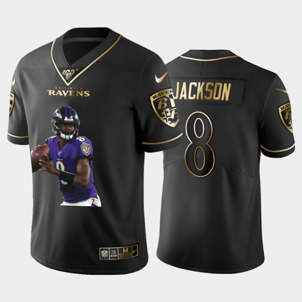 Home NFL Jerseys Baltimore Ravens Men’s Baltimore Ravens #8 Lamar Jackson Black Golden 100th Season Portrait Edition Limited Stitched Jersey