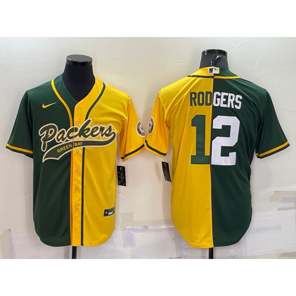 Home NFL Jerseys Green Bay Packers Men’s Green Bay Packers #12 Aaron Rodgers Green/Yellow Split With Patch Cool Base Stitched Baseball Jersey