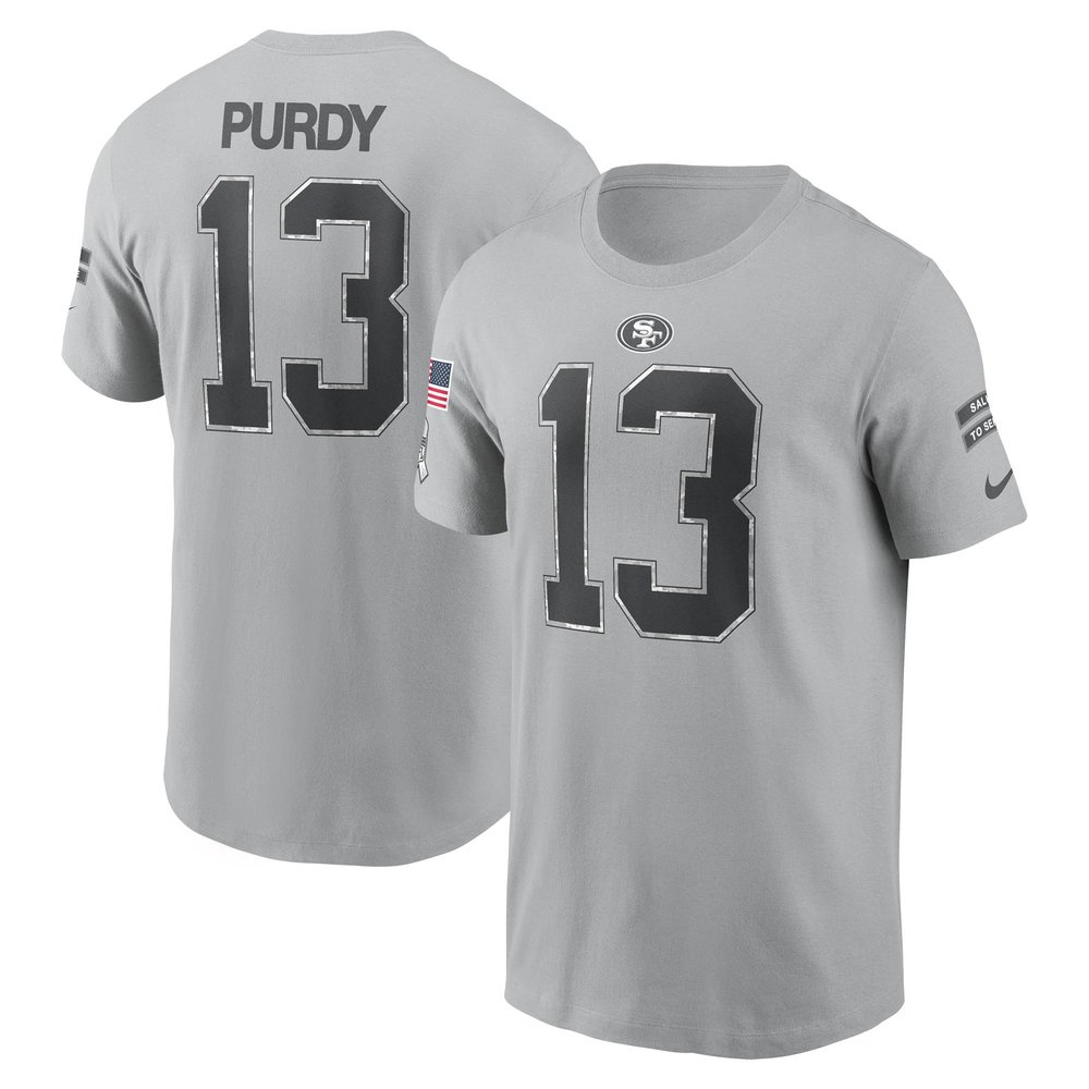 Home NFL Jerseys 2024 Salute to Service Men’s San Francisco 49ers Brock Purdy Gray 2024 Salute To Service Name & Number T-Shirt
