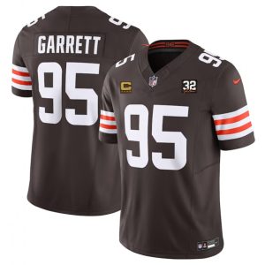 Men’s Cleveland Browns #95 Myles Garrett Brown 2023 F.U.S.E. With John Madden Patch Vapor Limited Stitched Football Jersey